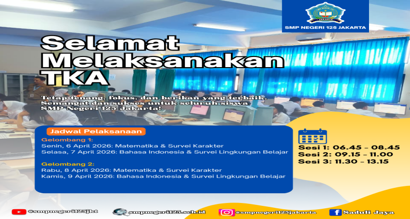 SMP Negeri 125 Jakarta secara resmi melaksanakan kegiatan Tes Kemampuan Akademik (TKA) dan Asesmen Nasional (AN) yang dimulai pada hari Senin, 6 April 2026 hingga Kamis, 9 April 2026.