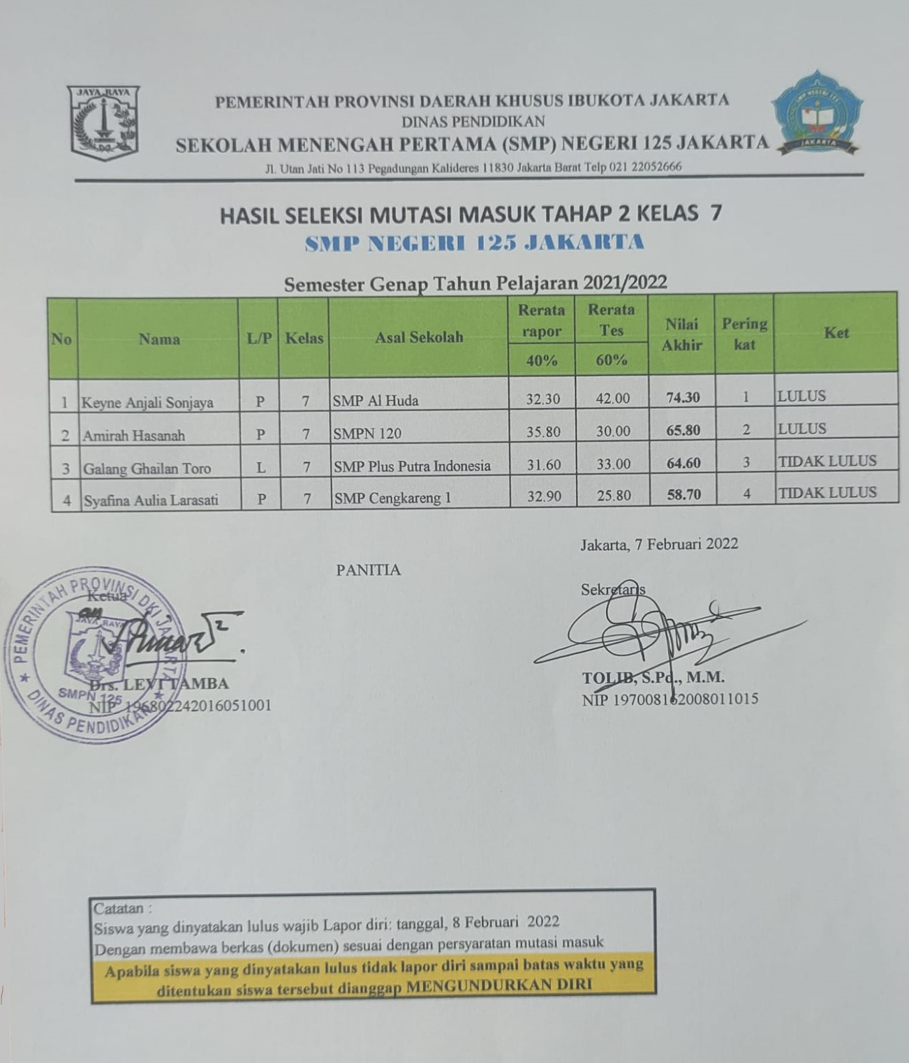 PENGUMUMAN HASIL SELEKSI DAN LAPOR DIRI PERPINDAHAN MURID SEMESTER GENAP SMP NEGERI 125 JAKARTA TAHUN AJARAN 2025/2026